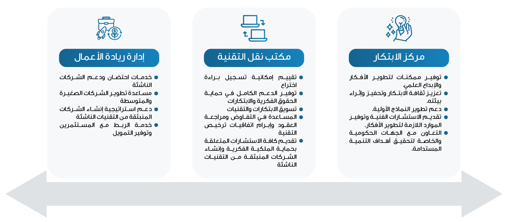 إدارة حاضنات ومسرعات الأعمال لاحتضان المشاريع الريادية وتحويلها إلى منتجات وخدمات ناجحة، ودعم إطلاقها في السوق
